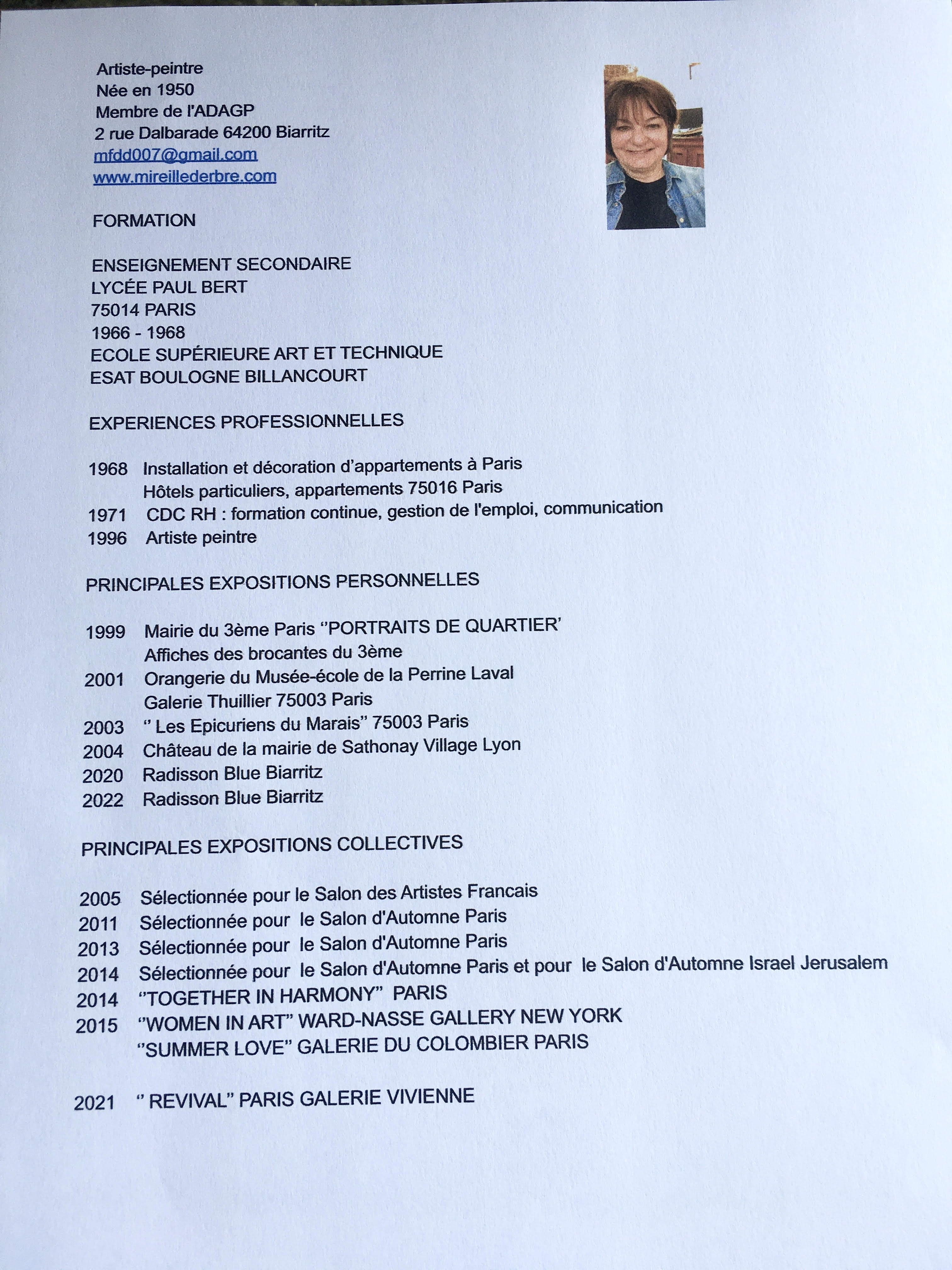 Mireille Derbré née à Paris. Formée depuis l’enfance dans l’atelier de son père le sculpteur Louis Derbré. Etudes artistiques à l’Ecole Supérieure Art et Technique à Boulogne Billancourt. Formation orientée vers la décoration, plusieurs grands chantiers sont exécutés à Paris essentiellement. Dans le même temps recherche d’expression à travers la peinture et l’organisation d’événements.
